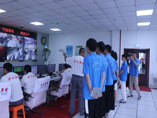 谈话结束后,为更好的深入调研,姚书记又带领实践团来到泉头集团水泥厂。据了解,泉头集团成立于2000年,是一家集水泥生产、销售,发电,房地产开发,精工制造等多种产业于一体的综合民营集团企业。集团下辖枣庄金桥旋窑水泥有限公司、枣庄市中区狮子山建筑石料用灰岩矿有限公司、枣庄市天工精密机械有限公司、枣庄市泉头房地产置业有限公司等多家子公司。泉头集团拥有员工1000余人,技术人员600余人,享受国家特殊津贴人员2人。集团注册资本3.8亿元,总资产近16亿元,年产值15亿元。工作人员于中央控制室为我们进行了详细讲解。通过监控画面,实践团观察到整个集团的操作流程都是由中央控制室的实时监控来进行控制,集团实现全体自动化。同时集团积极采取除尘措施,采用最新的除尘设备,保持国家环保局实时监测污染排放。除此之外,泉头集团也促进了当地约50%的村民就业,带动了当地经济的持续发展。