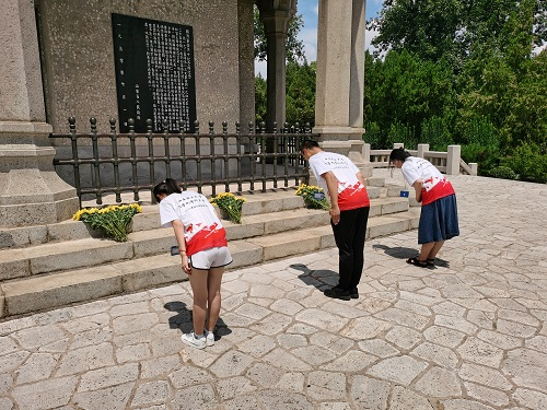 志愿者们面向烈士纪念碑献唱《中华人民共和国国歌》,向烈士表达传承“忠爱国家、追求和平、无私无畏、舍身为民”精神的意愿。伴随着深情的《献花曲》,Cu-Zn暑期社会实践团队的三位成员共同举起鲜花,缓步走向烈士纪念碑,将鲜花摆放在纪念碑基座前,在烈士墓碑前低头鞠躬并默哀三分钟,静静追思。