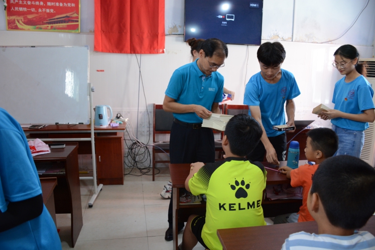 临近下课,团委老师跟孩子们进行交流,与孩子问答互动。团委老师的到来,不仅鼓励了实践团成员,也给孩子们带来学习动力,鼓励孩子们热爱学习。孩子们得到学习物品后,脸上洋溢着快乐。