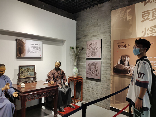 墙上的丘陵麦田图片、地上的水井、汉磨、石碾等表明是周村特有的地理环境为周村烧饼独特风味的形成提供了前提条件。周村烧饼通过店铺、沿街叫卖等多种方式销售,博物馆通过投影技术表现了沿街叫卖的情景,这让实践队员仿佛置身古街,身临其境。