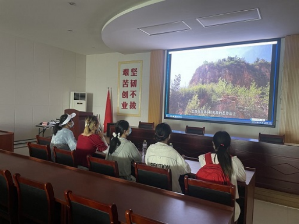 紧接着在解说员的带领下,团队观看了记录九间棚一路变化的纪录片,记载着在极其艰苦的条件下九间棚人在村党支部书记刘嘉坤的带领下,在一片片悬崖峭壁之中完成了修路、架电、治水等一项项大工程,纪录片中提到由于前期修路治水消耗了大量财力,九间棚的居民各个都成了欠债户,于是在村中党员带领下九间棚先后发展了塑料厂、机械配件厂等企业,最终选定金银花产业进行乡村振兴,并且取得了非常好的成效。团队成员深刻的体会到了九间棚人顽强拼搏、坚韧不拔、艰苦创业的精神。