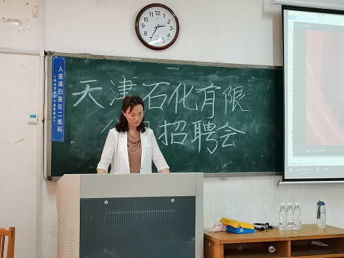 胡玉华首先通过播放天津石化有限公司的宣传短片向同学们介绍公司,使同学们对该公司有了初步了解。她详细介绍了天津石化有限公司的三大优势:一是集团优势,天津石化有限公司作为国有企业,国家给予了其很多政策优势;二是地域优势,她从交通、房价、医疗、教育四方面讲述了在公司周边生活的便利;三是环境优势,她介绍了公司的工作环境、学习环境、生活环境和文化环境,使同学们对在天津石化有限公司的工作环境有了进一步的了解。