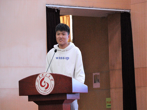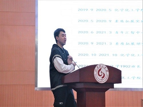 化工1804班邸贺祥以“适应大学生活”为主题,希望新生在学习上能够力争上游,做到不挂科、挣高分;交际上与人相处和睦、团结友爱;生活上做到卫生成绩达标,坚持体育运动,增强体魄,他提到这不仅可以更快速、更高质量地适应大学生活,同时对于提升自己的各项能力也有很大的帮助。