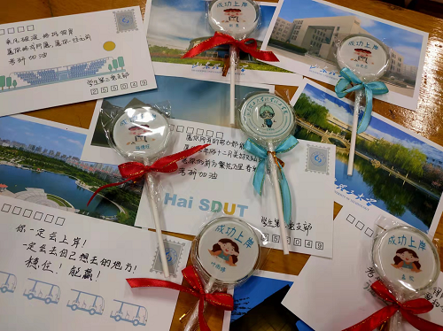 本次活动,学生第三党支部为支部考研学子准备了暖心加油包,其中包含印有支部考研学子名字的专属定制糖果,寓意着“棒”上有名;以及由支部成员手写祝福语的山理工明信片,寓意着千“研”万语,一起祝福。礼包由学生第三党支部成员亲手传递给支部考研学子,预祝他们终成所愿,金榜题名。