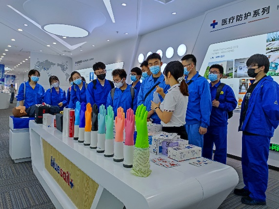 首先,在蓝帆集团人力资源部刘部长的引领下,师生一起前往蓝帆集团的蓝帆医疗展厅,了解蓝帆集团的发展历程,参观蓝帆医疗的心脏支架、吻合器超声刀、医用手套、急救包等核心产品,感受蓝帆集团对企业员工的职业发展的扶持和“开放、包容、规范”的企业文化。